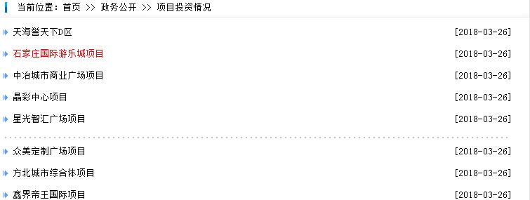3月26日,石家庄市裕华区人民政府网站上更新了裕华区2018年8个重点项目投资情况,包括鑫界帝王国际项目,方北城市综合体项目,众美定制广场项目,星光智汇广场项目,晶彩中心项目,中冶城市商业广场项目,石家庄国际游乐城项目和天海誉天下D区。蓝荷算了一下,这8个项目预计总投资约156.22亿。这中间比较新颖的就是石家庄国际游乐城项目了,投资主体包括:石家庄万科房地产开发有限公司、天域蓝海(珠海横琴)管理顾问有限公司、河北乐水房地产开发有限公司。项目将建设大马戏剧场、室内游乐园、六星级酒店、国际会展中心等。8个重点项目投资及规划详情如下。