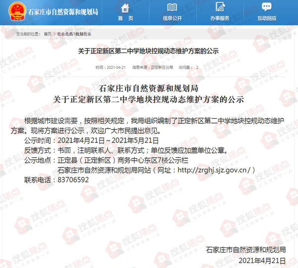 石家庄市自然资源和规划局发布了《关于正定新区第二中学地块控规动态维护方案的公示》