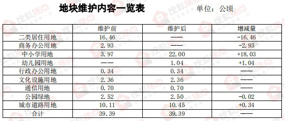 该地块维护后,二类居住用地减少16.46公顷(约合246.9亩),商业服务业设施用地减少2.93公顷(约合43.95亩),中小学用地增加18.03公顷(约合270.45亩),幼儿园用地增加1.04公顷(约合15.6亩),行政办公用地、文化设施用地、通信用地保持不变,公园绿地用地减少0.02公顷(约合0.3亩),城市道路用地增加0.34公顷(约合5.1亩)。