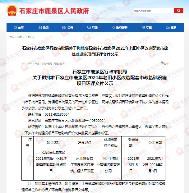 搜狐焦点“楼市快讯”报道:7月2日,搜狐焦点获悉,石家庄市鹿泉区人民政府发布了《石家庄市鹿泉区行政审批局关于拟批准石家庄市鹿泉区2021年老旧小区改造配套市政基础设施项目环评文件公示》。