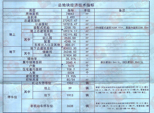 根据项目总平面图及经济技术指标表显示,东杜庄城中村改造项目二期用地面积74843平方米(约合112.26亩),总建筑面积272927.47平方米,其中地上总建筑面积189274.17平方米,地下总建筑面积83653.30平方米,容积率2.499,绿地率35.01%,建筑密度19.95%,规划户数1676户,机动车停车位1952辆。拟建设17栋住宅楼,1栋配套楼和1所幼儿园。