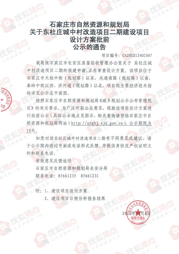 搜狐焦点“楼市快讯”报道:4月9日,搜狐焦点获悉,石家庄市自然资源和规划局鹿泉分局发布了关于东杜庄城中村改造项目二期建设项目设计方案批前公示的通告。