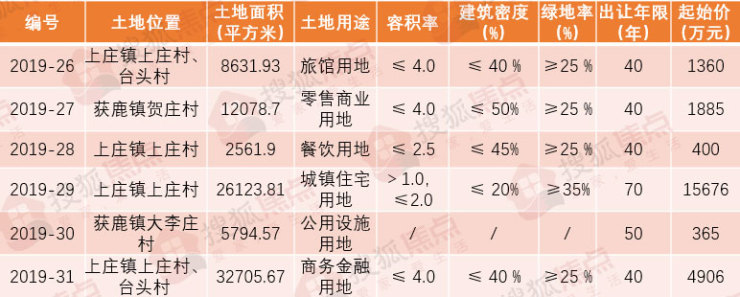 2019-31号地块,位于上庄镇上庄村、台头村,面积为32705.67平方米(约合49.06亩),规划用途为商务金融用地,容积率≤ 4.0,出让年限为40年,起始价为4906万元。