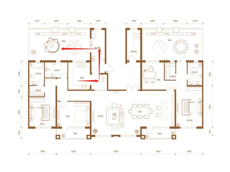 厨房、餐厅北侧都有窗,即使在餐厅用餐或者在厨房做饭,都能直接看到入户花园的生活场景。花园北侧是佣人房,拥有独立卫生间,整个家政动线非常合理。