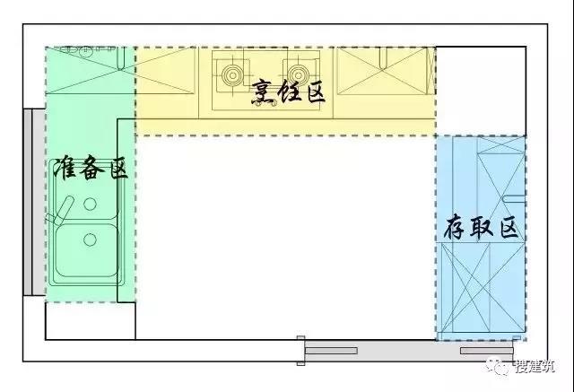 U型是沿连续的三个墙面布置洗、切和烹调区,洗涤池在一侧,切和烹调区相对布置,这样能形成较为合理的厨房工作三角形,操作路线短,操作效率高。