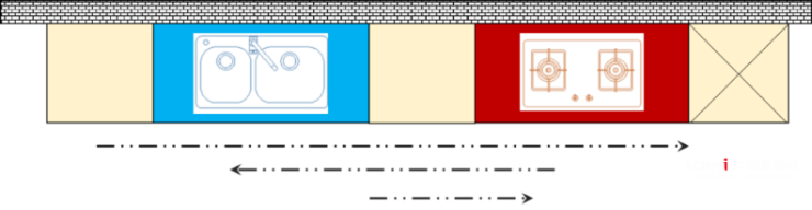 橱柜沿墙面一字排开,动线在一条直线上,空间划分精炼清晰,节省空间,注重实用性和操作性,但操作流线过长。适合空间小,特别窄长,或者通常只占据一个过道的厨房。
