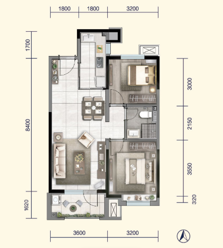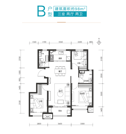 融创臻园壹号建筑面积约98㎡户型,厨房为U型半开放式布局,小三室也实现了餐厨客厅互通互连的功能。