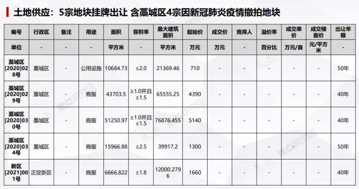 当周的石家庄土地市场无甚亮点,但因本轮新冠肺炎疫情而暂停的藁城区土地市场宣告重启。此前受疫情影响而撤拍的4宗地块重新挂牌出让,后续还将有撤拍地块和新增挂牌出让地块入市。当周新增挂牌出让地块5宗,面积12.82万平方米,约合192亩。其中,房地产开发用地4宗,面积176亩,均系商服用地,其中3宗位于藁城区,1宗位于正定新区。